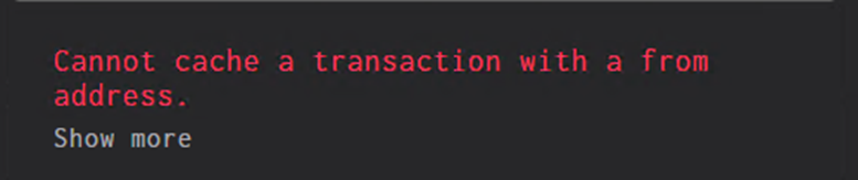 Replace throw new Error(`Cannot cache a transaction with a 'from' address.`); by delete e.transaction.from; and throw new Error("Cannot cache a transaction with a 'from' address."); by delete e.transaction.from;.