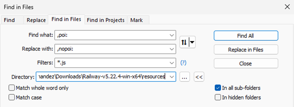 >asar extract app.asar unpakedThen, you just need to modify the all the instances of the string ,poi: found in the .JS files by ,nopoi:, as in the figure below: