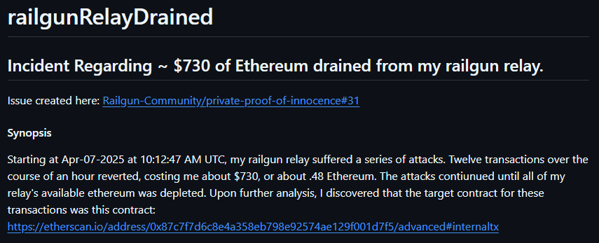 Yikes. A Railgun broadcaster operator reporting their funds got drained by reverting TXs? That’s… not great.