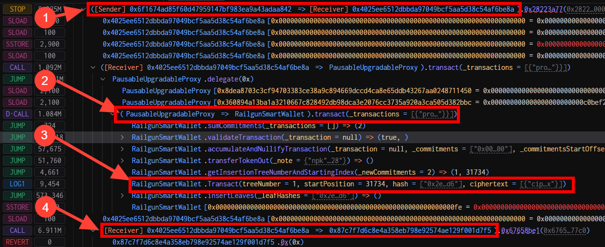 RailgunSmartWallet(0xfa7093cdd9ee6932b4eb2c9e1cde7ce00b1fa4b9) to perform atransact. - The gotcha: After the